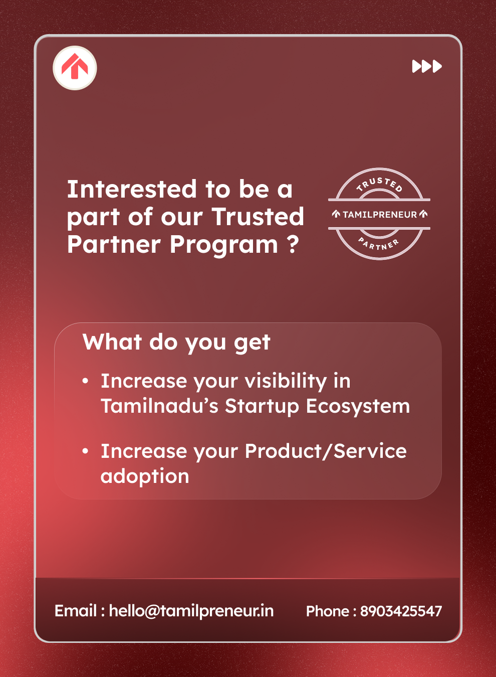 If you meet the evaluation criteria, Tamilpreneur will seamlessly onboard you into our Trusted Partner Network.